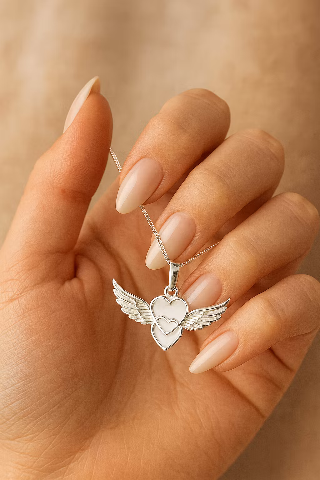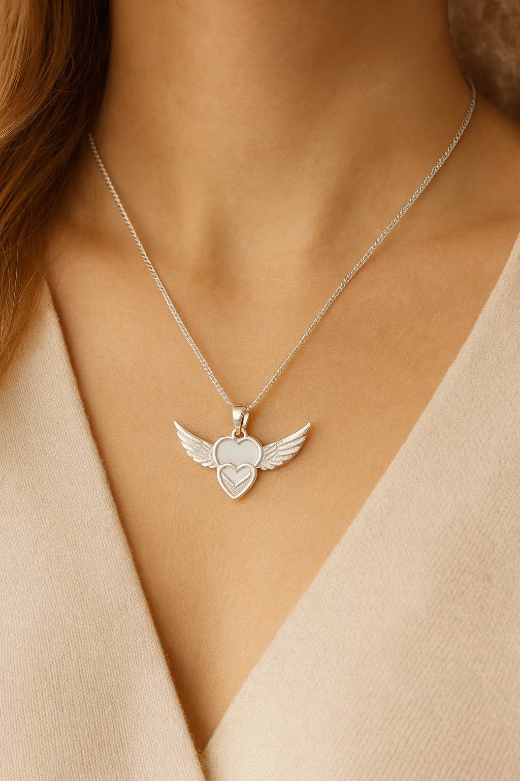 Kärlekens Änglar är ett exklusivt hänge i 925 sterling silver, skapat för att fånga den oändliga kärleken mellan dig och ditt barn. Det vackra dubbelhjärtat omfamnas av eleganta änglavingar som symboliserar trygghet, styrka och det band som aldrig kan brytas. I det större hjärtat kan din bröstmjölk förseglas som ett tidlöst minne, och för dig med två barn finns även möjligheten att inkludera bröstmjölk från båda, antingen tydligt separerade eller mjukt sammanförda till en harmonisk helhet. Varje hänge blir ett unikt bevis på er historia, en personlig skatt som bär med sig stunderna du aldrig vill glömma. Kärlekens Änglar är mer än ett smycke, det är kärlek, minnen och magi att bära nära hjärtat varje dag.
