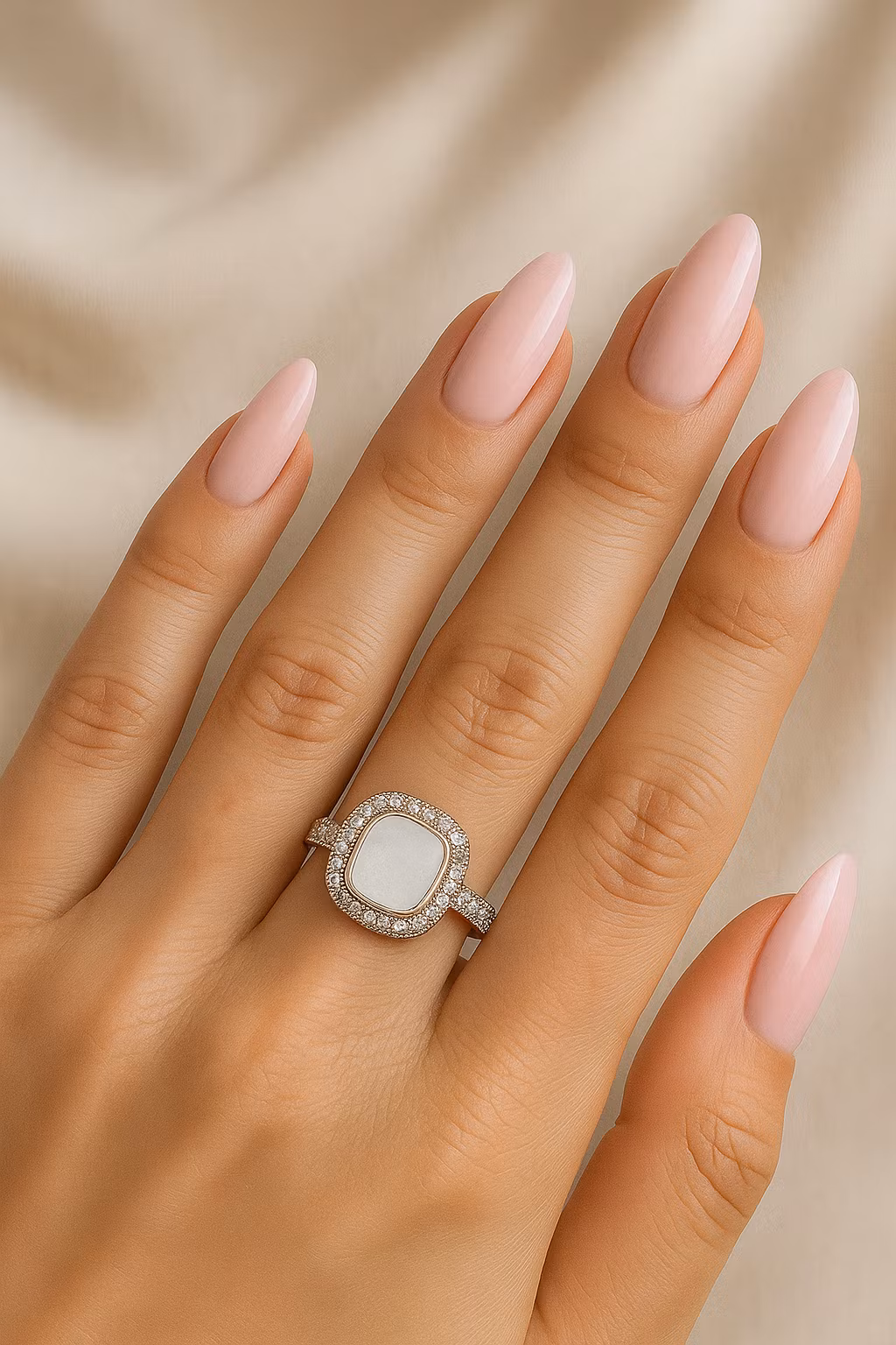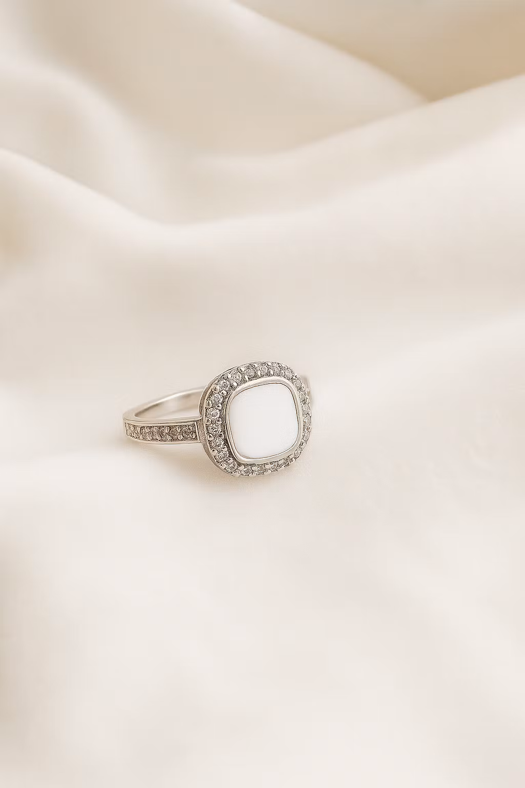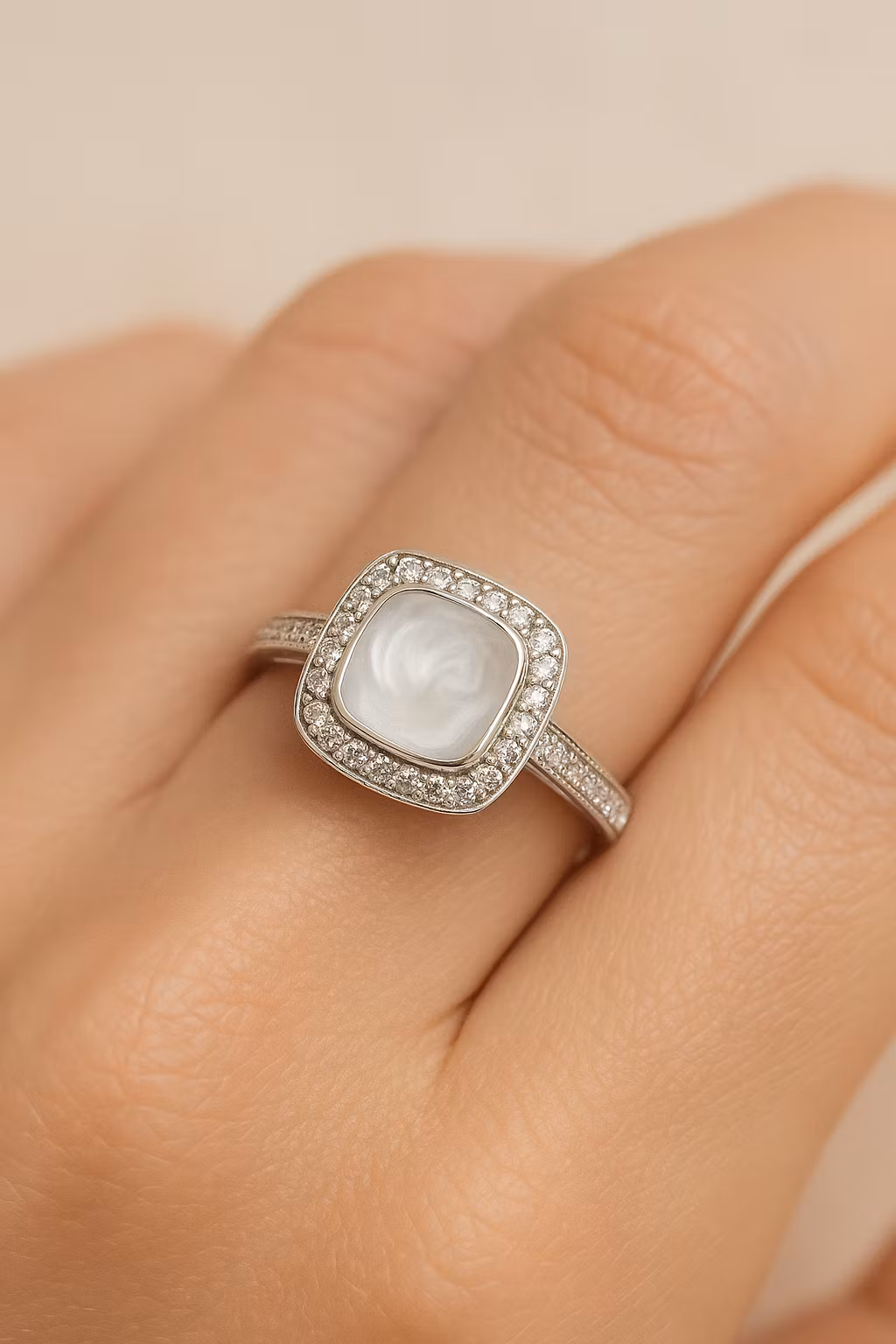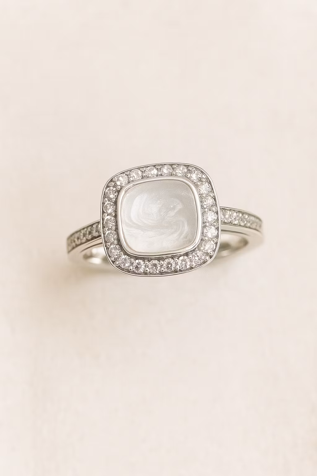 Runt pärlan ligger en ram av glittrande stenar som fångar upp varje stråle av ljus och låter ringen stråla på ett lyxigt men harmoniskt sätt. Ringbandet fortsätter med samma gnistrande stenar, vilket ger ett vackert flöde av skimmer runt hela fingret. Tillsammans skapar det en känsla av ren elegans, som om ringen andas i takt med dina känslor.