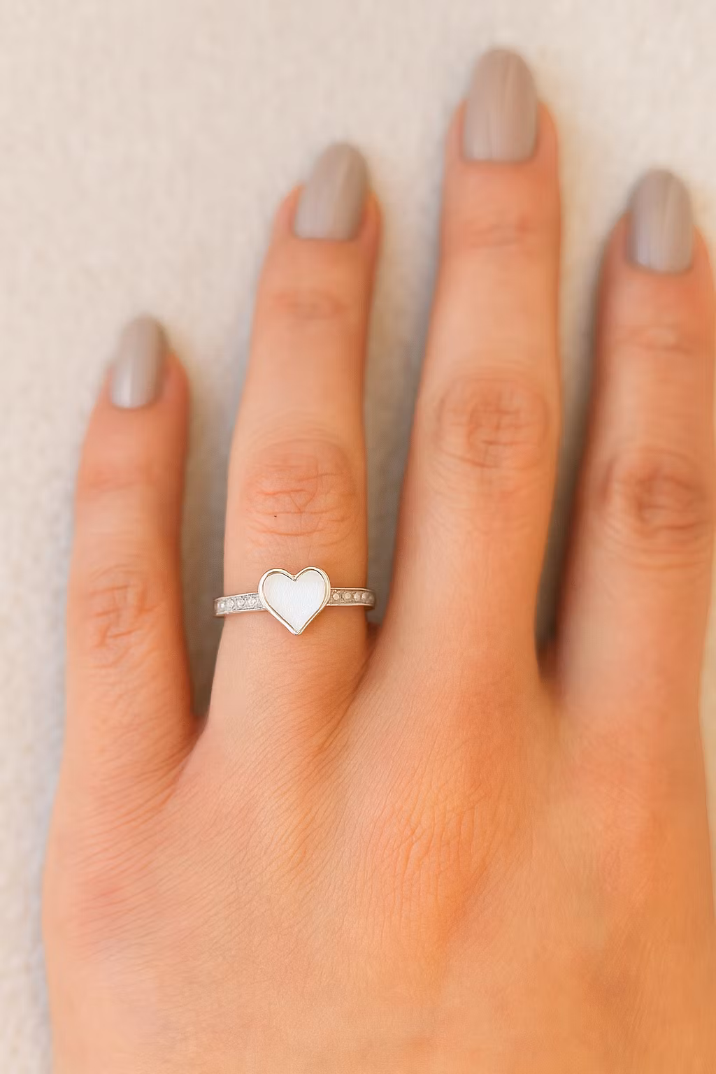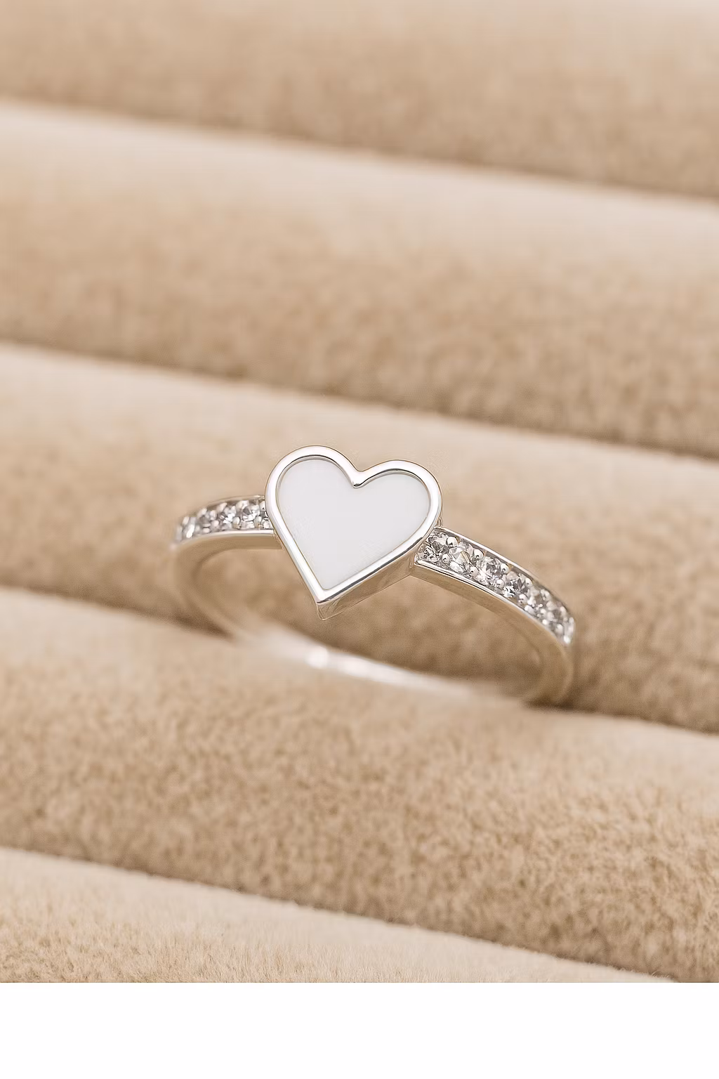 Längs skenan glittrar en rad klara stenar som förhöjer hjärtats mjuka uttryck och ger ringen en lyxig, tidlös framtoning. Kombinationen av det rena hjärtat och den skimrande omgivningen skapar ett smycke som känns både subtilt och sofistikerat.