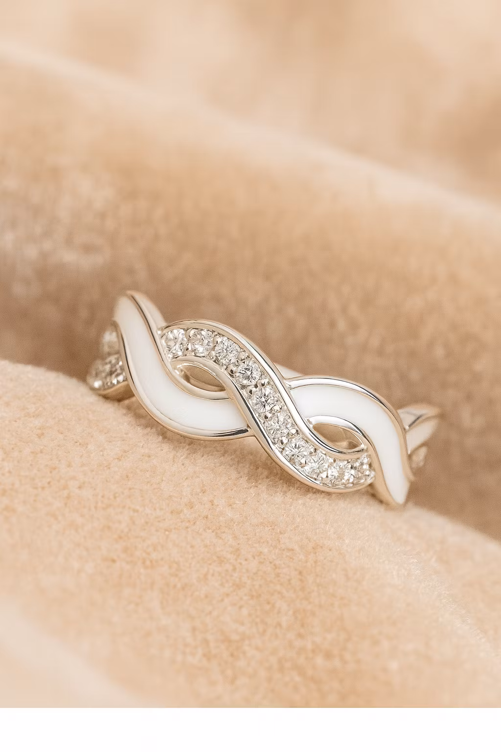 Kärlekens Harmoni är en ring som fångar essensen av balans, närhet och livets stilla rytm. Den vackra, svepande designen låter två linjer mötas i en elegant dans: en linje fylld med din egen bröstmjölk och en linje som gnistrar av klara stenar. Tillsammans skapar de ett harmoniskt spel mellan mjukhet och glans, mellan minne och magi.