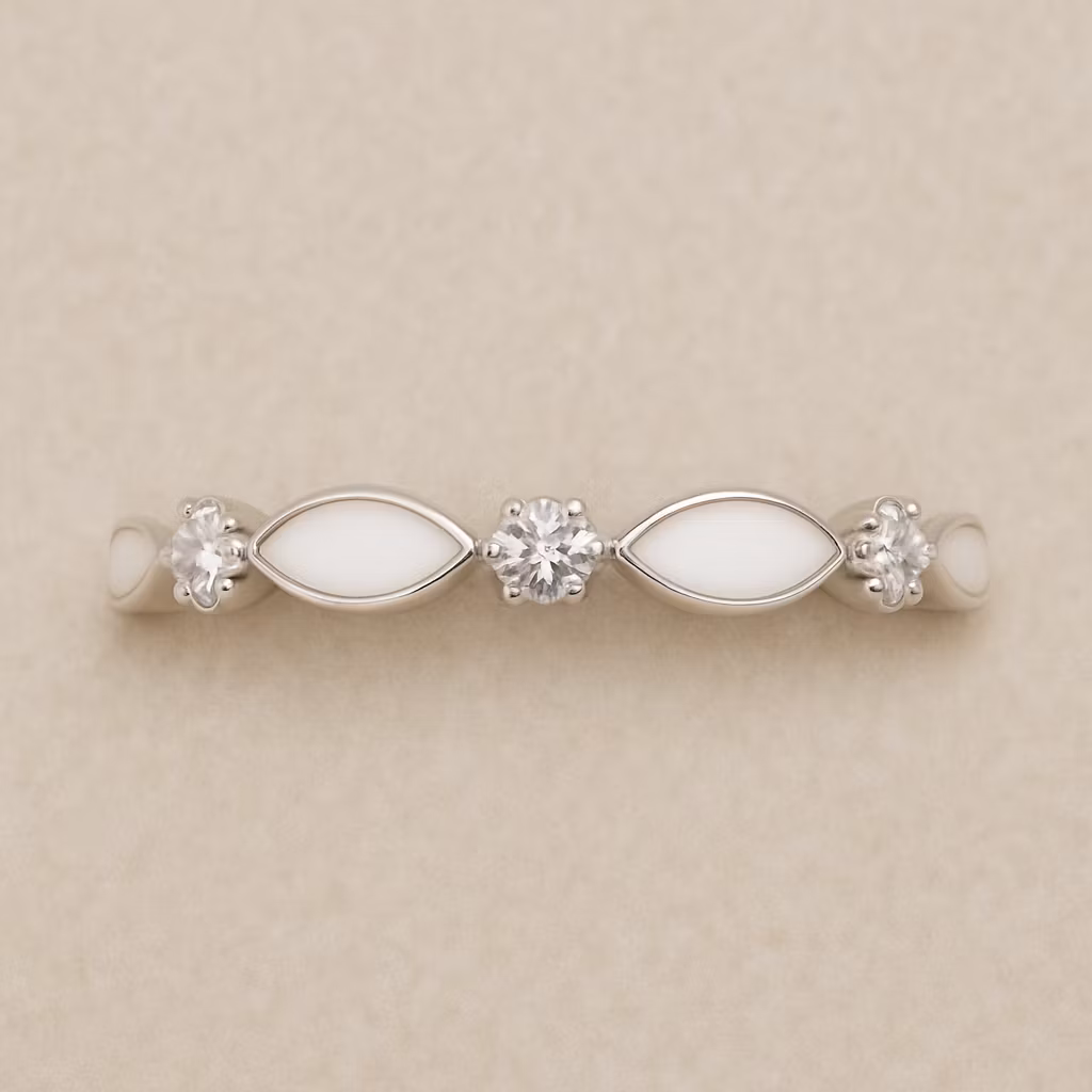 Mellan varje mjölkpärla glittrar exklusiva stenar som för tankarna till små gnistor av hopp, glädje och framtid. Tillsammans bildar de en obruten rad av ljus som omfamnar fingret med ett mjukt, sofistikerat skimmer. Resultatet är en ring som andas både känsla och lyx i varje detalj.