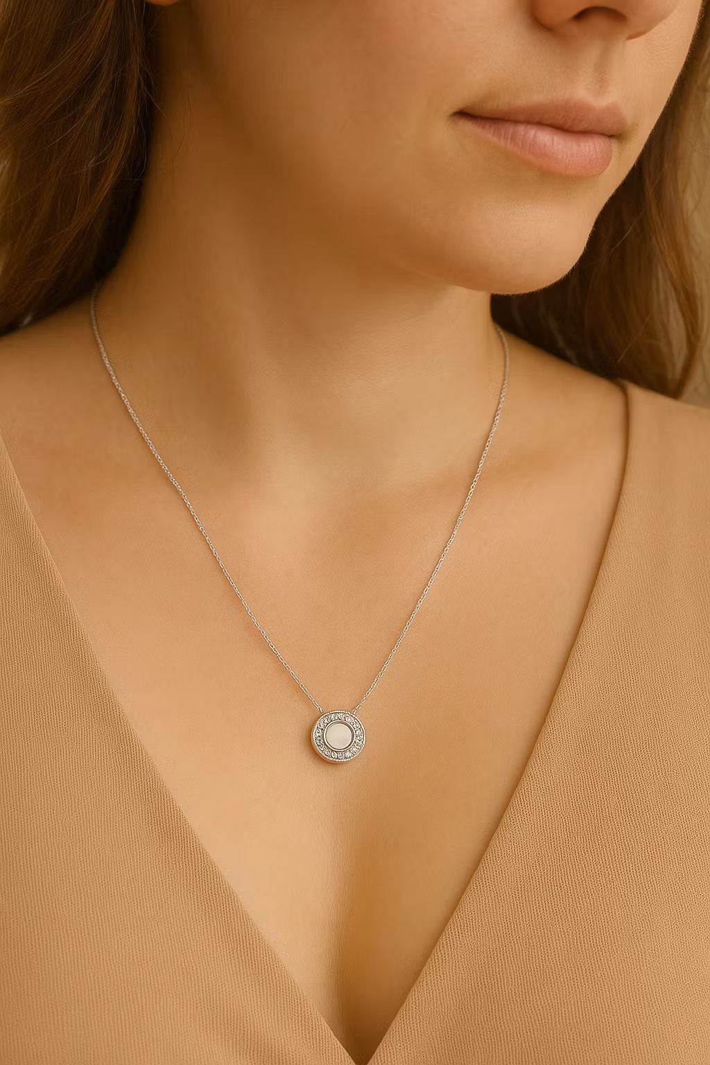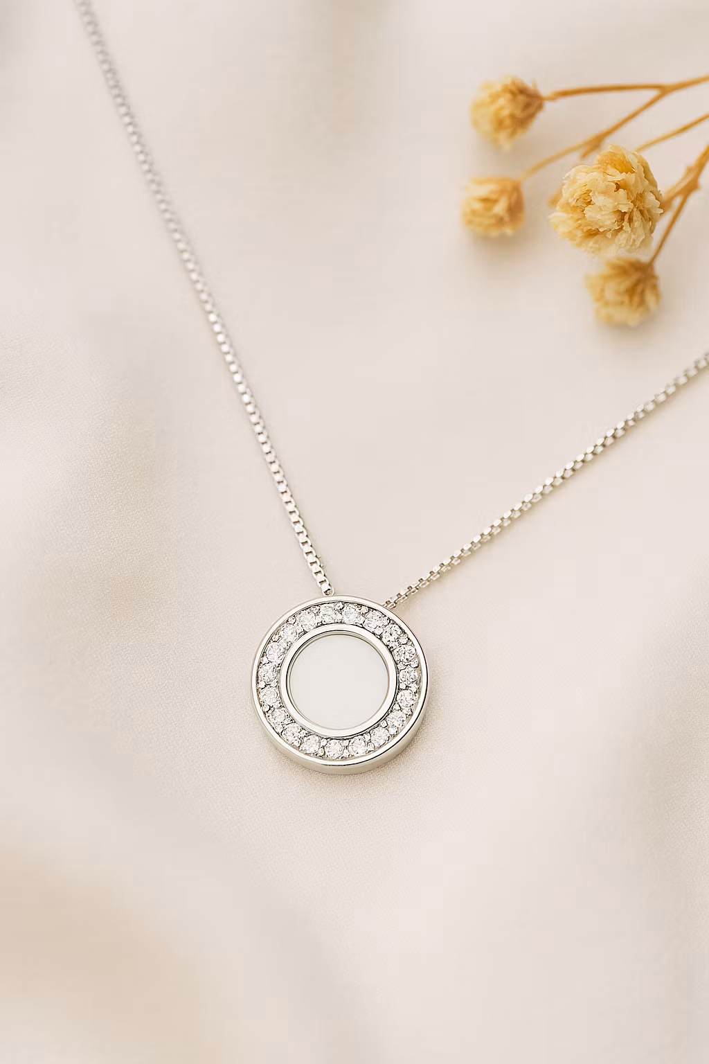 Kärlekens Sol är ett elegant och strålande hänge som fångar allt det vackra i de minnen du vill bära nära hjärtat. Den perfekta runda formen symboliserar livets cirkel, och den gnistrande stenkanten runtom ger smycket en varm, solkysst glans. I mitten finns plats för din bröstmjölk som varsamt förseglas till ett tidlöst och personligt minne, skapat för att bevara de stunder som betyder mest. För dig som önskar det finns även möjlighet att inkludera hårstrån i designen. Skriv gärna till oss om detta så formar vi smycket tillsammans och återkommer med ett prisförslag.